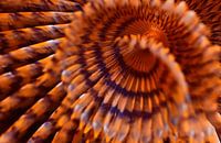 Een abstracte en fascinerende close-up van een zeeanemoon, die zijn betoverende radiale structuur en golvende tentakels onthult. Warme tinten oranje, amber en goud stralen naar buiten in een hypnotiserend patroon, waardoor een sterk gevoel van beweging en natuurlijk ritme ontstaat. Het beeld vervaagt de grens tussen realisme en…