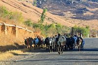 Prachtige opname van een kudde Zeboe's op weg over de weg in het binnenland van Madagaskar