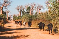 Een typerende foto uit Madagaskar: een kudde zeboes loopt over een zandweg die aan beide kanten wordt geflankeerd door enorme baobab bomen.