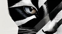 Grafisch portret van een kat met zebra‑strepen, scherpe lijnen en contrasterende zwart‑witte tinten — moderne en mysterieuze dierenkunst op canvas.