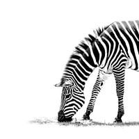 Een zwart-wit, vierkant, highkey beeld van een grazende zebra die een lichte schaduw werpt op de weide. De lichte achtergrond en de beeldcompositie creëren een minimalistisch beeld dat heel goed alleen of samen met andere beelden werkt.