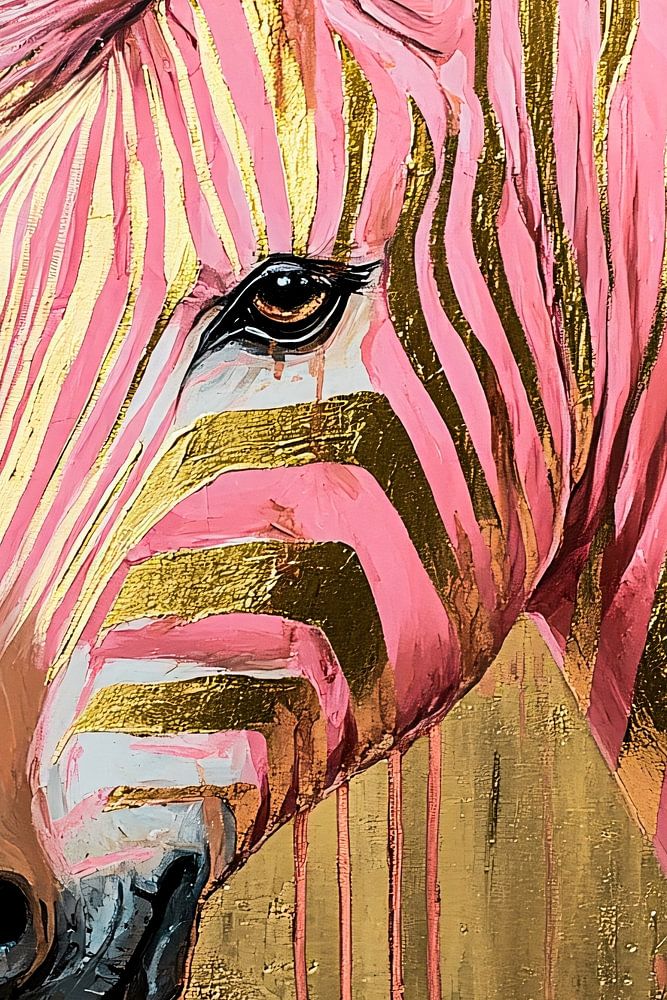 Dit opvallende schilderij combineert een surrealistisch ontwerp met een levendige kleurenpalet van roze en goud. De verf loopt subtiel langs de strepen van de zebra, wat een uniek, modern en artistiek gevoel geeft. Het goud op de achtergrond benadrukt de luxe uitstraling en voegt diepte toe aan het geheel. Dit kunstwerk is perfect om een ruimte zoals een slaapkamer of kantoor een unieke en creatieve sfeer te geven. Ideaal voor liefhebbers van eclectische en surrealistische kunst, of gewoon voor degenen die een vleugje luxe en speelse charme in hun interieur willen brengen.