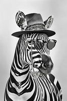 Een zwart-witte zebra met een stijlvolle hoed en ronde zonnebril in een elegant studioportret.