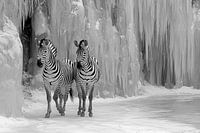 Zebra's in een sneeuwlandschap of zelfs een Arctisch landschap roept een surrealistische en contrasterende sfeer op. Zebra's, die we associëren met warmere savannes en graslanden, lijken compleet buiten hun natuurlijke habitat te zijn geplaatst.