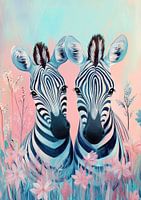 Zebra's - Op dit tuin schilderij zie je twee vrolijke zebra's met zwarte en witte strepen, omringd door kleurrijke bloemetjes in pastelkleuren, wat een vrolijke sfeer voor in de tuin creëert.