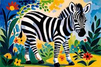 Dit speelse en levendige ontwerp toont een zebra omgeven door een explosie van kleur en natuur. Het beeld heeft een moderne en expressieve stijl met duidelijke invloeden uit de Pop Art-beweging. De zwart-witte strepen van de zebra contrasteren sterk met de felgekleurde bloemen en bladeren, wat een dynamisch en energiek gevoel geeft. Dit kunstwerk is perfect voor een kamer waar een vrolijke en levendige sfeer gewenst is, zoals een keuken of slaapkamer. Het ontwerp straalt positiviteit uit en kan een unieke blikvanger zijn in elk interieur. De felle kleuren zorgen ervoor dat het stuk opvalt en een speelse toets geeft aan elke ruimte.