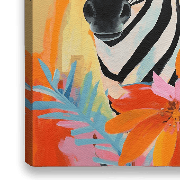 De mooie zwartwit gestreepte Zebra in zachte vriendelijke tinten. Grote bloemen tegen een blauwe achtergrond. De opvallendste van allemaal met het kenmerkend patroon over het hele lijf. Indrukwekkend mooi.