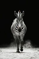 Een krachtig natuurmoment ontvouwt zich met een majestueuze zebra wiens opvallende strepen schitteren in een indrukwekkende zwart-wit esthetiek. De dynamische pose en het vleugje stof voegen leven en energie toe aan de afbeelding. Ideaal voor in de woonkamer, het brengt een vleugje wildheid en avontuur in huis.