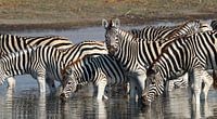 Grote groep drinkende zebra's in de rivier in Botswana maken een mooi strepen pallet.