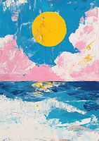 Een roze en blauwe lucht met een gele zon, witte wolken en oceaangolven. Een eenvoudige schilderstijl met krachtige penseelstreken en heldere kleuren. Een minimalistische compositie, in de stijl van olieverf op canvas.