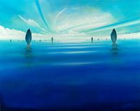 De meest opmerkelijke elementen van dit schilderij zijn echter de boomachtige eilanden die als stenen bomen uit de zee oprijzen. Deze rijzen majestueus op uit het water en geven het tafereel een bijna mystieke kwaliteit. De combinatie van de zachte golven, het levendige wateroppervlak en de grillig gevormde eilanden creëert een uniek en fascinerend landschap.