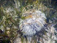 Zee-egel in Zeegras, Lac Cai Bonaire. witte egel met op zijn pennen stukjes met zeegras gepind.