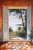 Zee en Boom | Landschap vanuit het Raam - Op dit moderne landschap schilderij zie je een prachtig uitzicht door een open raam, met een serene zee en een groene boom, waardoor een sfeervol en vrolijk gevoel ontstaat.