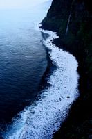 Foto van de kust van Madeira, Portugal. Het eiland ligt midden in de Atlantische Oceaan en heeft een ruige kust met steile kliffen. Het diepe water van de zee is donker en de rotsen zijn bijna zwart, terwijl de golven, de branding en de kleine waterval licht zijn. Een mooi contrast dat voor een mysterieuze foto zorgt. Deze foto is genomen aan de noordkant van Madeira, tussen Porto Moniz en Seixal.