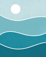 Abstracte minimalistische illustratie van de zee en zon. De zon en de lijnen zijn wit. De blauwe vlakken hebben een lichte structuur.
