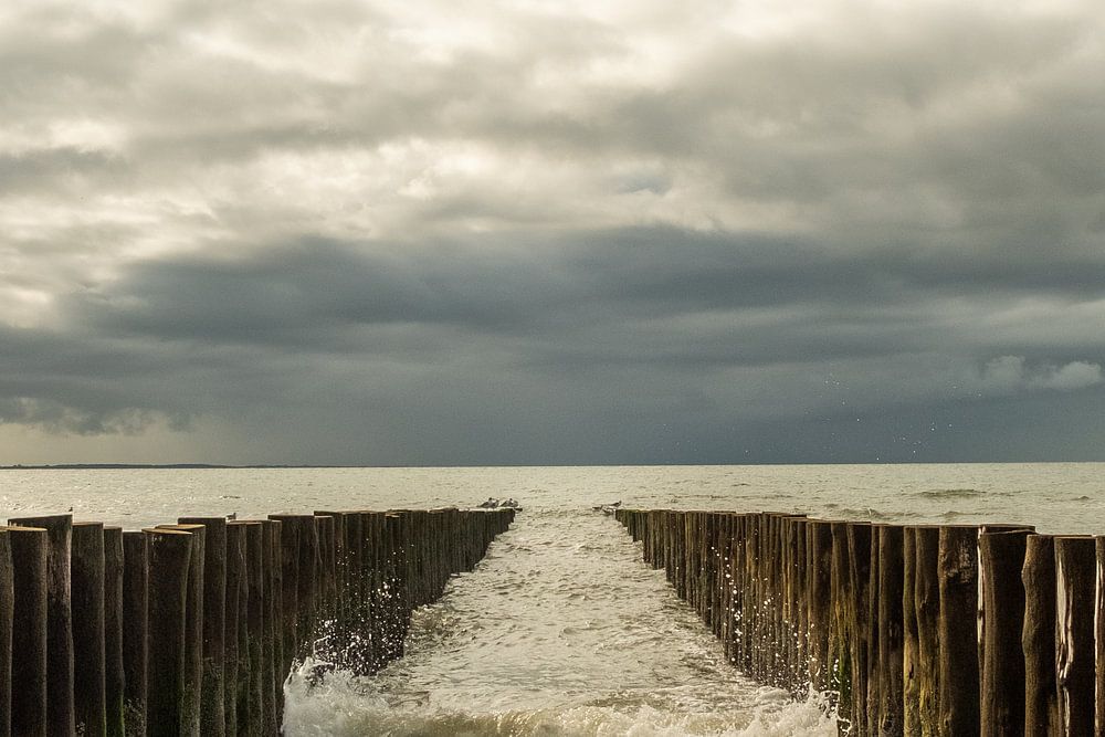 Zeezicht voor de kust bij Haamstede, Zeeland. Het water stroomt tussen de golfbrekers door het strand op.