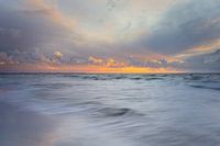 Vloeiende bewegingen van de Noordzee tijdens zonsondergang waar de wolken een spel spelen met de kleuren in de lucht.