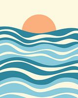 Abstracte minimalistische illustratie van een landschap waarin een combinatie van de zee en de ondergaande zon te zien zijn. De illustratie bevat blauwe tinten en een warme perzik kleur als zon. De achtergrond is licht geel.