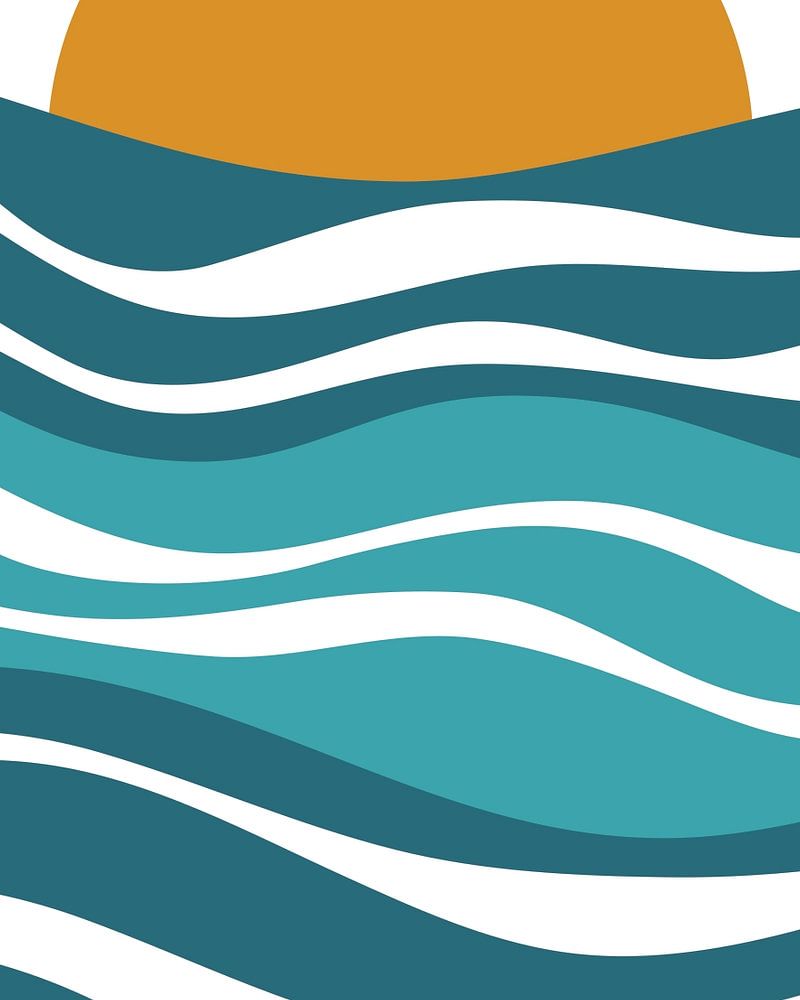 Abstracte minimalistische illustratie van een landschap waarin een combinatie van de zee en de ondergaande zon te zien zijn. De illustratie bevat blauwe tinten en een warme mosterd gele kleur als zon.