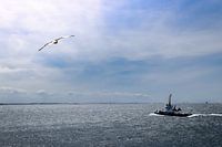 Uitzicht op zee op Vlissingen strand met een voorbij varende boot en een weg vliegende meeuw