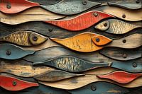 Dit levendige kunstwerk toont een speels patroon van gestileerde houten vissen, geschilderd in een rijke mix van blauw, rood, geel en aardetinten. De reliëflagen en verweerde texturen geven een gevoel van beweging en harmonie, alsof een kleurrijke school vissen door het water glijdt. Ideaal voor een rustiek, bohemien of nautisch interieur, brengt dit werk een vrolijke en dynamische energie in elke ruimte.