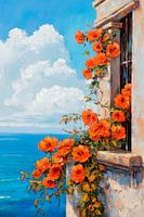 Een dromerig samenspel van fel oranje en diep blauw ontvouwt zich bij het raam. Weelderige, bloeiende planten omarmen de muren en brengen leven in de kalmte van de zee beneden. Zachte wolken dansen in de lucht en weerspiegelen de warmte van een zonnige dag, terwijl de natuur ongehinderd bloeit en het beeld van harmonieus zorgeloos leven…