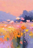 Een impressionistisch schilderij toont een bloemenveld in levendige tinten roze, oranje, geel en paars. De bloemen zijn vormgegeven met zichtbare penseelstreken en een gestructureerd kleurvlak, waardoor diepte en beweging ontstaan. Op de achtergrond strekt een lichtroze lucht zich uit over gedempte paarsgrijze bergen, terwijl donkere vormen aan de horizon bomen of struiken suggereren. Het warme kleurenpalet en de losse, expressieve penseelstreken geven de scène een levendige, harmonieuze sfeer die de aandacht trekt en de schoonheid van een weelderig, bloeiend veld vastlegt.