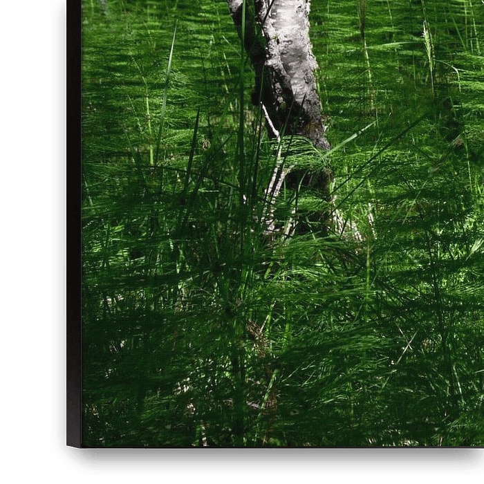 Zonlicht speelt met een zee van groene varens. Noorwegen. Zonsopkomst zorgt voor fris licht en subtiel schaduwwerk. Witte stam van berkenboom zorgt voor mooi contrast.