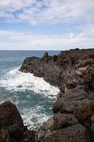 Mooie grillige vormen van de gesmolten Lava die in zee stroom tegen de heerlijke azuur blauwe zee