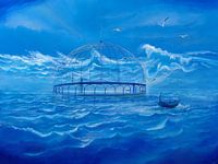 Het huidige schilderij, geschilderd in koel blauw, presenteert een fascinerend en riskant tafereel dat de poging van de mens afbeeldt om de natuur te controleren en te isoleren in een kunstmatige omgeving. Het is een weergave van twee werelden die op het eerste gezicht niet meer tegengesteld zouden kunnen zijn: de uitgestrekte zee en de kunstmatige volière, gebouwd op de zee, klaar voor licht. Op de achtergrond dreigt een stormgolf al dicht bij de fijne structuur te komen.
