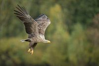 Zeearend / Zeearend / Seeadler ( Haliaeetus albicilla ) in krachtige vlucht voor de rand van een loofbos, wildlife, Europa.