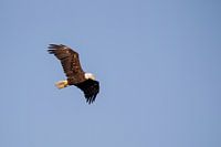 Zeearend (Haliaeetus leucocephalus) in vlucht boven Port Renfrew op Vancouver Island, British Columbia, Canada.