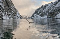 De imposante Zeearend in actie met de besneeuwde bergen van het Fjord op de achtergrond. Wauw wat een vogel. Een spanwijdte van minstens 2 meter een karakteristieke kop en gigantische klauwen. Scherend over het water op jacht naar vis een echte roofvogel. Deze heeft net een haring gevangen.