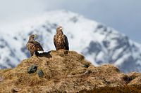 Twee zeearenden kijken om zich heen. Ze zitten op een verhoging in het landschap. Op de achtergrond is een wit besneeuwde bergtop te zien.