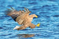 Zeearend duikt tijdens een zonnige winterdag in het water in een fjord vlakbij de Lofoten in Noord-Noorwegen.