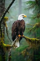 De adelaar troont majestueus op de met mos bedekte tak, zijn scherpe, gouden ogen doorboren de dichte mist van het bos. Het contrast tussen zijn stralend witte kop en diepbruine verenkleed geeft hem een aura van kracht. Te midden van de rustige natuur straalt hij een indrukwekkende aanwezigheid uit die zelfs de stilste geluiden van het…