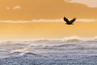 Een zeearend vliegt over de met golven bezaaide zee. De middernachtzon baadt het landschap in gouden licht.