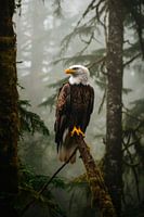 In het dichte, mystieke landschap van het bos troont een majestueuze zeearend op een tak. Zijn sneeuwwitte kop steekt scherp af tegen zijn donkere verenkleed. Omringd door in mist gehulde, eeuwenoude bomen straalt hij gratie en kracht uit, terwijl zijn scherpe, gele klauwen zijn verbondenheid met de natuur en zijn onbetwiste dominantie benadrukken.