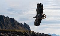 Op zoek naar een adembenemende afbeelding om je huis of kantoor te verfraaien? Wat dacht je van deze prachtige foto van een majestueuze zeearend die over de bergen in de Lofoten zweeft!