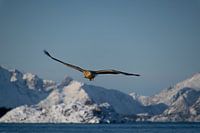 Een zeearend glijdt laag over de zee, met besneeuwde bergen op de achtergrond. Het beeld ademt stilte, ruimte en de koele helderheid van het winterse Lofotenlandschap.