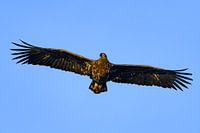 Zeearend (Haliaeetus albicilla) jaagt in een fjord nabij het eiland Vesteralen in Noord-Noorwegen.