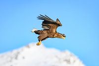 Zeearend (Haliaeetus albicilla) jagend in de lucht boven een Fjord bij de Vesteralen eilanden in Noord-Noorwegen met een besneeuwde berg op de achtergrond.