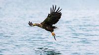 Een zeearend heeft een vis gevangen en vliegt met zijn prooi een paar centimeter boven het water weg.