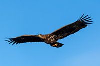 Zeearend (Haliaeetus albicilla) jagend in de lucht. De jonge vogel spreidt zijn enorme vleugels.