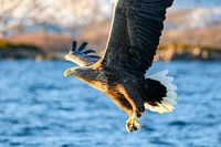 Zeearend (Haliaeetus albicilla) vangt een vis in een Fjord bij het eiland Vesteralen in Noord-Noorwegen.