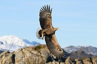 Zeearend (Haliaeetus albicilla) vangt een vis in een Fjord bij het eiland Vesteralen in Noord-Noorwegen.