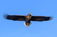 Zeearend op jacht in de lucht. De vogel spreidt zijn imposante vleugels tegen de helderblauwe lucht in de achtergrond. De Zeearend is de grootste roofvogel van Noord Europa met een vleugelspanwijdte van 200 tot 250 cm, daardoor wordt deze vogel ook wel de 'vliegende deur' genoemd.