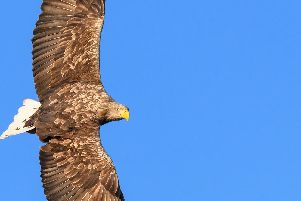 Zeearend (Haliaeetus albicilla) jagend in de lucht boven een fjord bij het eiland Vesteralen in Noord-Noorwegen. De arend spreidt zijn massieve vleugels en zijn scherpe, doordringende ogen, die scherp op de omgeving zijn gericht, scannen het fjordoppervlak eronder.