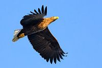 Zeearend (Haliaeetus albicilla) jagend in de lucht boven een Fjord bij de Vesterålen en Lofoten eilanden in Noord-Noorwegen tijdens een vroege winterochtend.