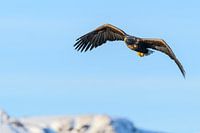 Zeearend of zeearend (Haliaeetus albicilla) jagend in de lucht boven een Fjord bij het eiland Vesteralen in Noord-Noorwegen.